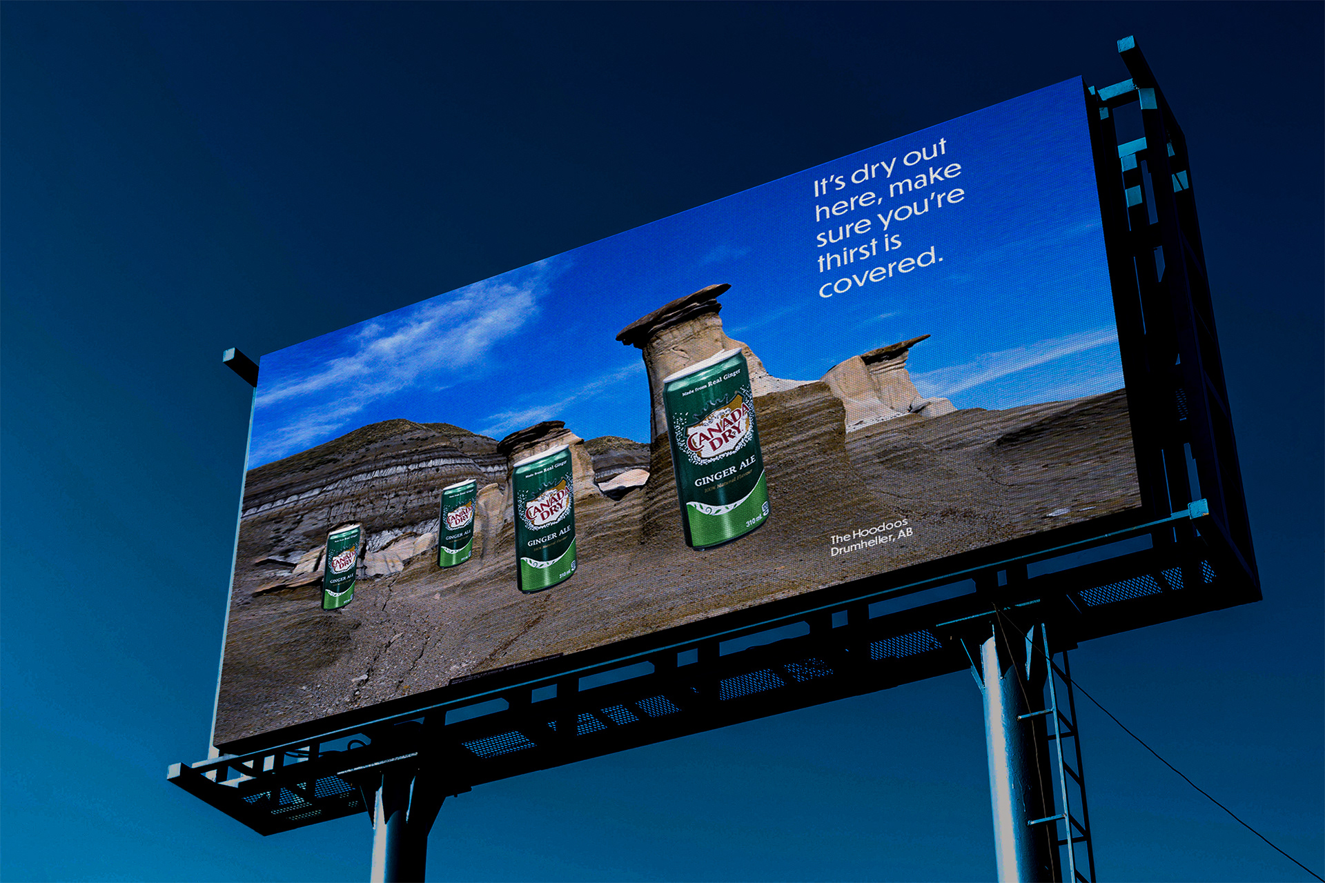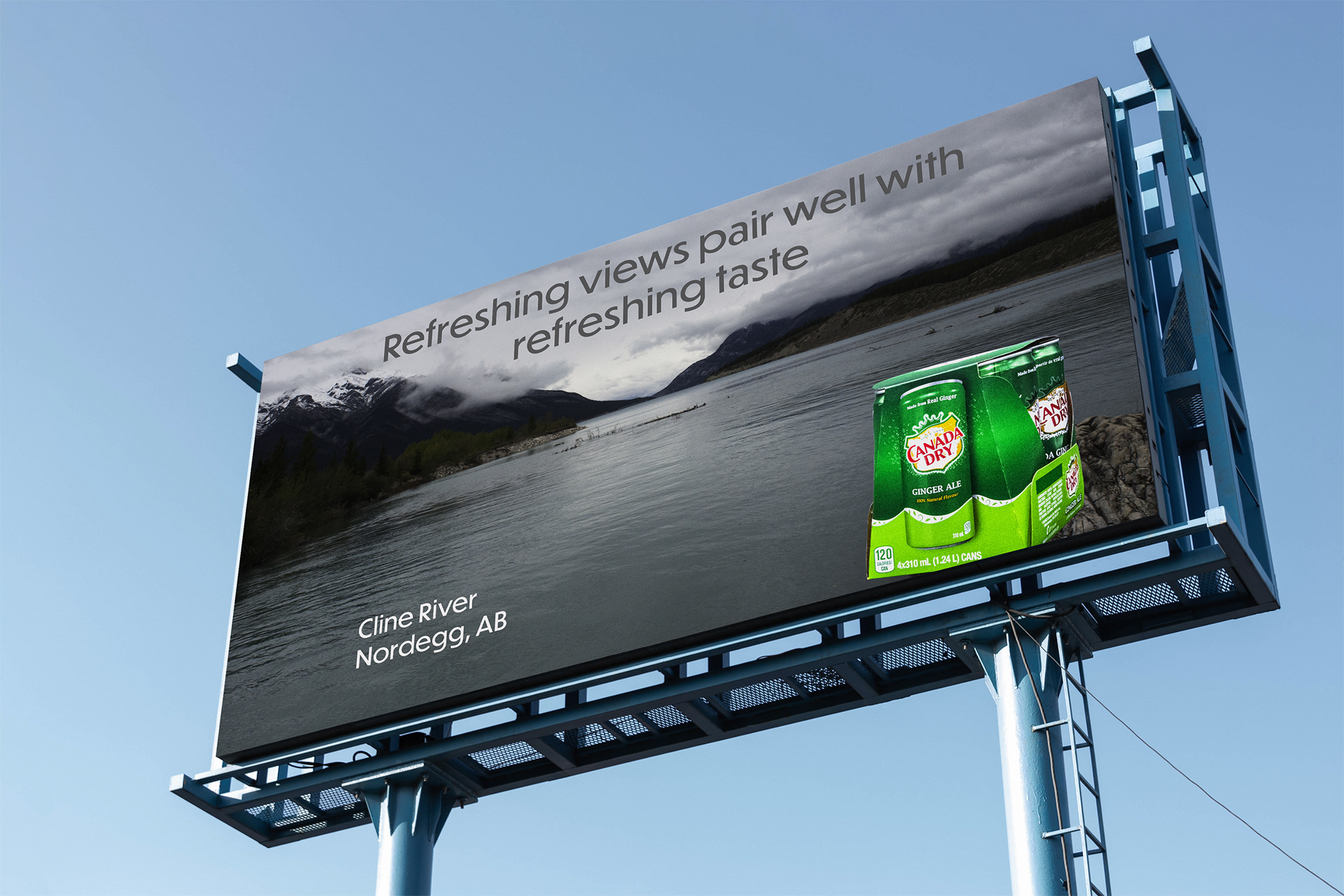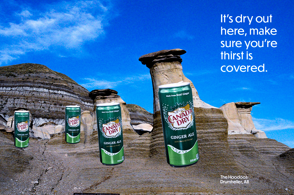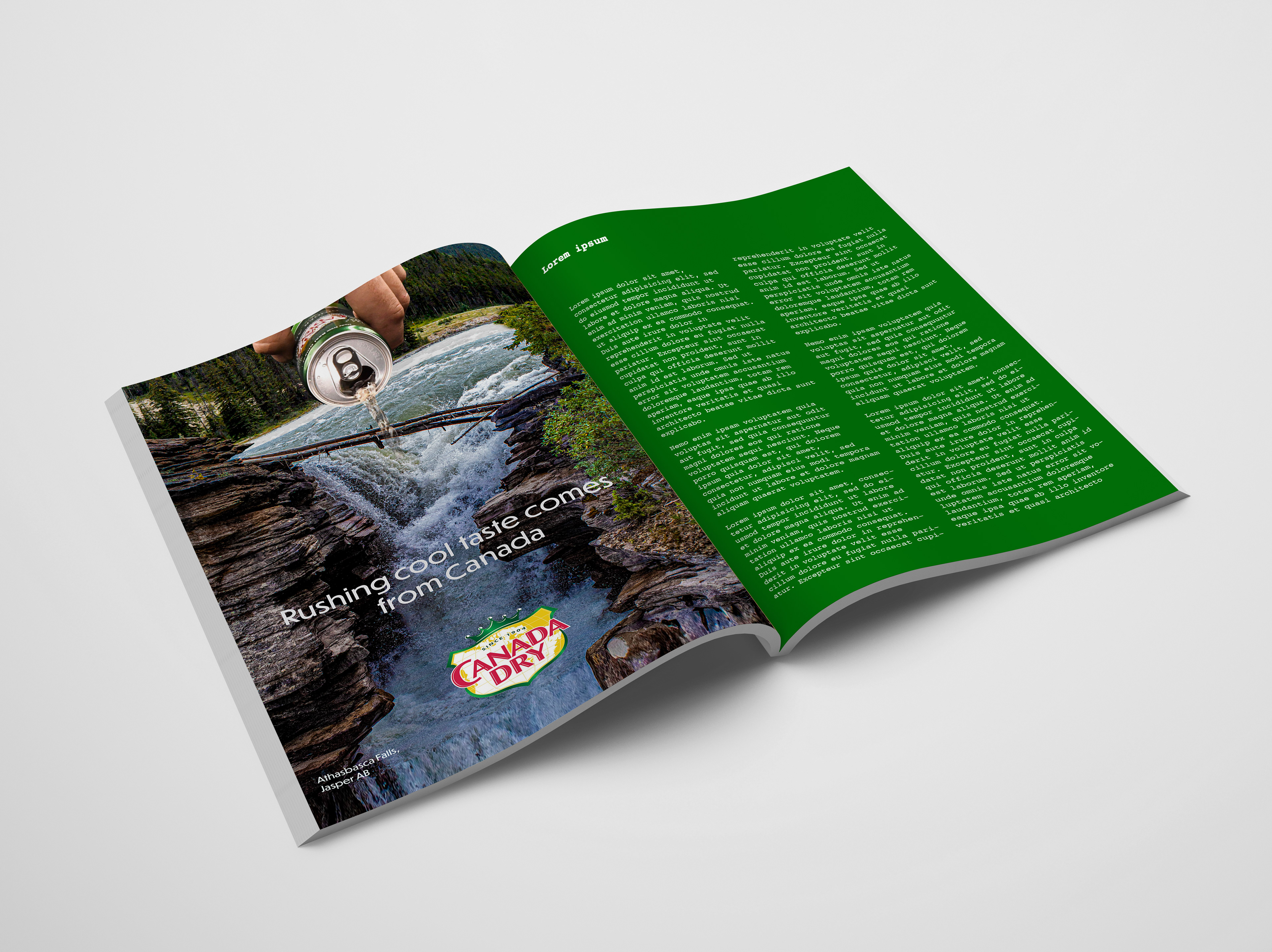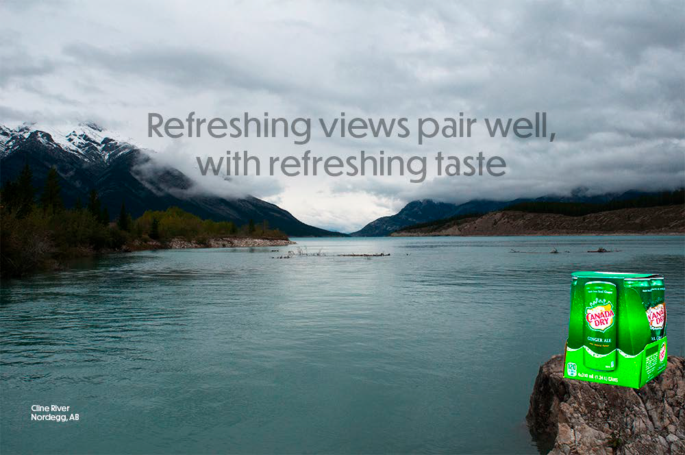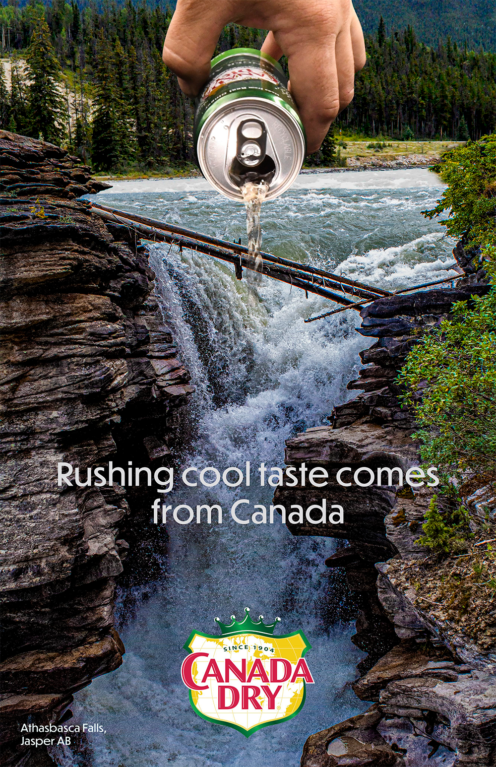 A soft drink known the world over for refreshing flavour, wanted to distance itself from a scandal relating to it’s claim of Real Ginger taste. To bring the brand a cleaner image, a Canadian wilderness landscape photo campaign was chosen. Using Photoshop compositing, product photography, and landmark wilderness treasures creates an image that suggests Canada Dry is still the country’s favourite ginger ale.