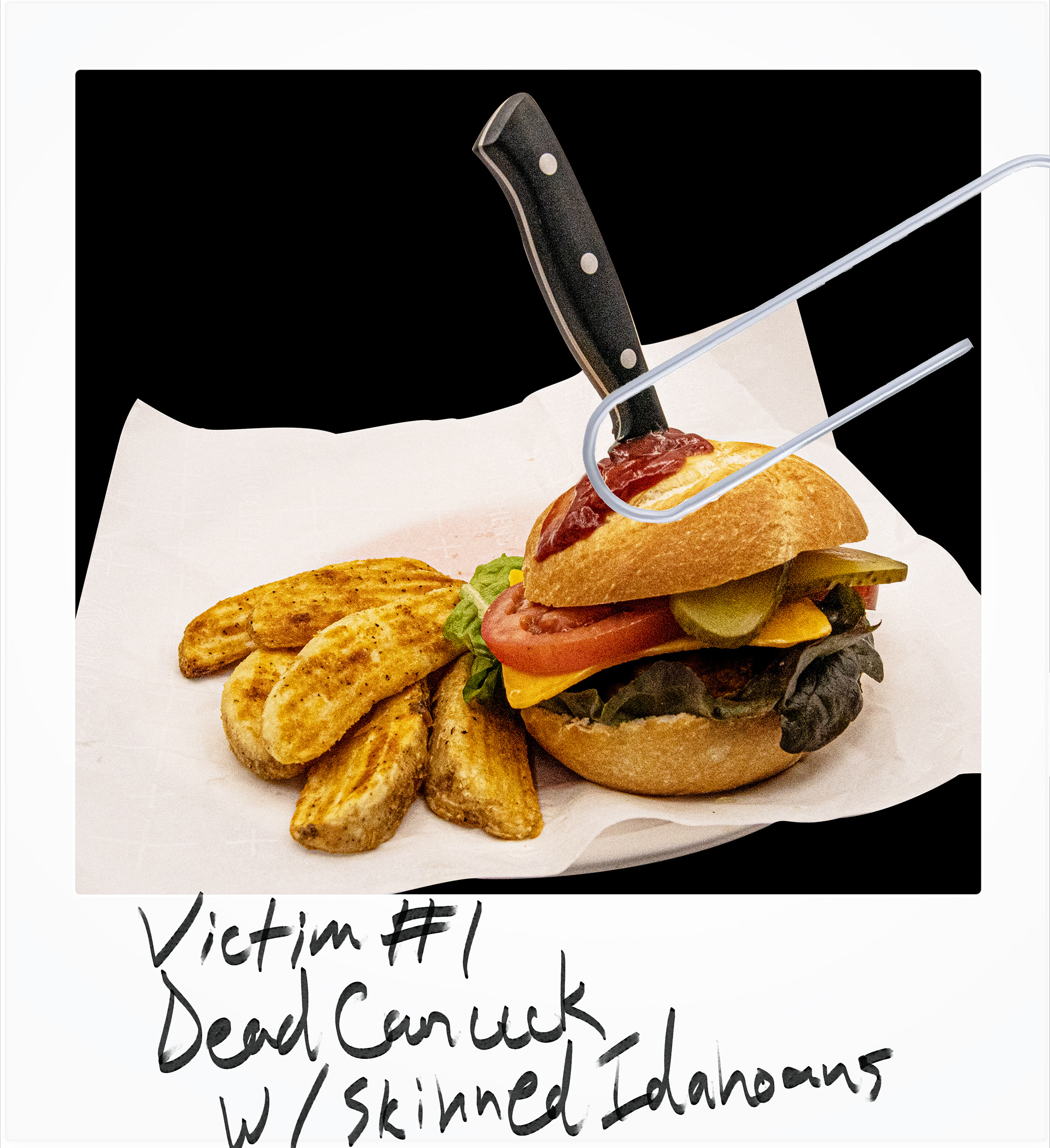Murder Burger is a restaurant branding concept geared towards attracting fans of police dramas, horror films, true crime documentaries and biographies. The restaurant tables and interior will be decorated with newspaper clippings of true crimes. The menu features a case file as the outer jacket, and specials will be Polaroid photos paper-clipped to the menu which is printed on newsprint using Baskerville, an official typeface of the government of Canada as well as the what is found in police report forms. Server tickets will be written up as an evidence tag. Aprons/uniforms will be printed with blood drips where the name tags are pinned. All dishes are named on theme, and referent to real and fictitious murder stories. Food will be served with cutlery stabbed into it.